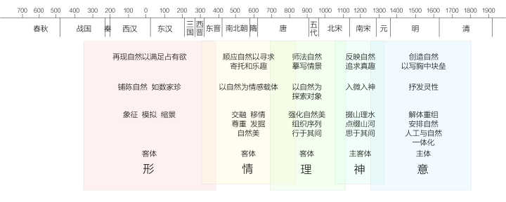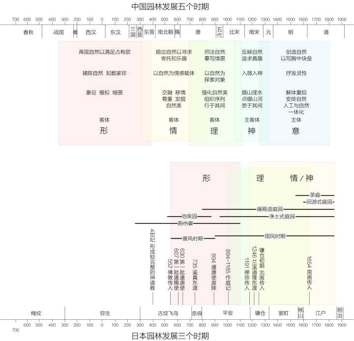 苏州园林和日本园林的异同是一个很庞大的命题,布局、理水、叠山等确实是园林很重要的部分。要想说清楚这个问题,我觉得有必要从中日园林的的发展脉络这一层面来看,下面我便来试图寻寻这一系列异同的过程,探索两国园林异同出现的历史背景与异同的内核。 首先理清一个概念,苏州园林只是中国园林的一个流派,而且仅仅表示了明清两代的江南园林成就。用苏州园林来比较日本园林似有不妥,因为其实中国对日本园林的影响不仅仅是源于江南园林,例如对日本影响极大的白居易,虽履任过苏杭,但是其园林的实践多见于中原,思想也是更偏于中原。因此,下面我的论述将不仅仅局限于苏州园林部分,而是希望以一个整体脉络来梳理中国园林。 一直以来我们对中国古典园林的发展其实一直是采取朝代这个说法来区分发展阶段,但冯纪忠先生提出过一个观点让我深切认同。这源于Ernst Casirer在《人论》中的一句话:“我们不能把艺术的东西根据来断代”,比如,唐的诗文书画和宋的诗文书画,文可以断在晚唐,诗可以断在五代,画可以断在南宋。所以,载体不同,结构不同,不能“一一对仗”。因此,在此我对中国园林的考察便依据冯先生的说法,以将中国园林的发展归纳为五个时期,可以分别对应“形、情、理、神、意”5个层面。从客到主,从粗到细,从浅到深,从抽象到具体: